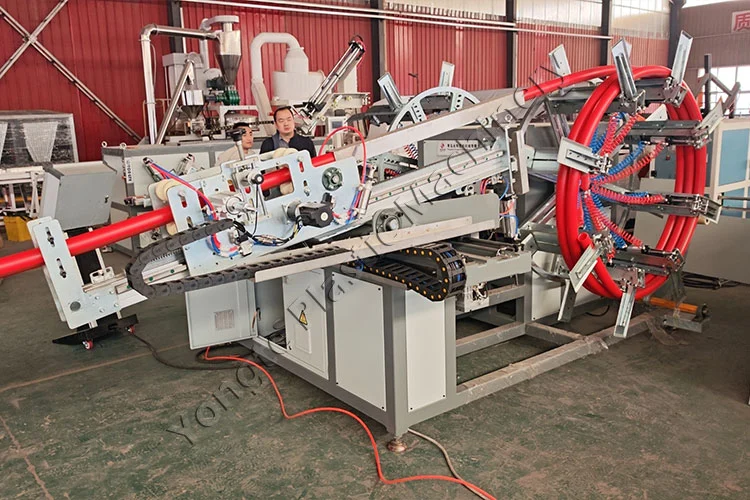 Leta 2025 smo vodilnemu argentinskemu podjetju za predelavo plastike uspešno dostavili dva prilagojena kompleta avtomatskih strojev za navijanje PE cevi. Stranka je zahtevala visoko učinkovite rešitve za navijanje, ki so se ujemale z njihovimi na novo razširjenimi linijami za ekstruzijo PE cevi za visoke hitrosti. Naročilo je obsegalo dve specializirani enoti: eno avtomatsko navijalno napravo z dvema postajama, optimizirano za cevi s premerom 15–32 mm, in drugi model visoke zmogljivosti, zasnovan za premere 20–63 mm. Ti stroji se brezhibno integrirajo s hitrimi linijami za iztiskanje PE cevi za samodejno navijanje cevi v enotne zvitke. Stroj, opremljen s sistemom za samodejno štetje dolžine, sproži samodejno rezanje in prenos postaje, ko je ciljna dolžina dosežena. Istočasno zavaruje dokončan zvitek in aktivira alarm za pakiranje, kar zagotavlja popolnoma avtomatizirano rešitev za navijanje. Strogo tovarniško testiranje pred odpremo je zagotovilo stabilno delovanje na kraju samem po dostavi.