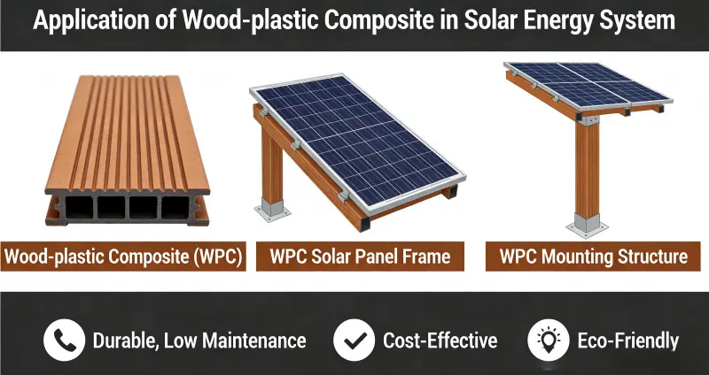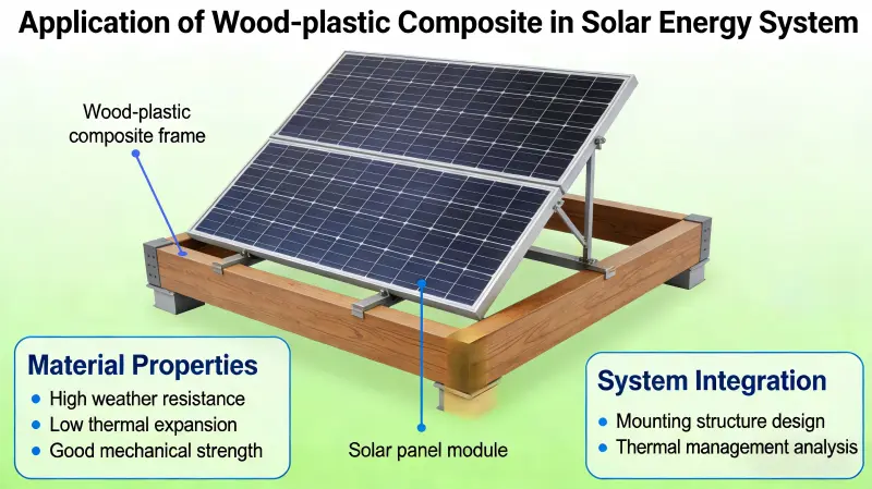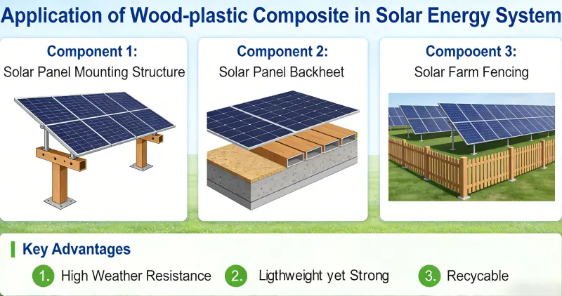 Lesno-plastični kompozit (WPC) se je zaradi svojih okolju prijaznih, vremensko odpornih, lahkih, nizkih vzdrževalnih lastnosti in lastnosti, ki jih je enostavno obdelati, izkazal kot ključni material v sistemih za sončno energijo, vključno s fotovoltaičnimi (PV) nosilci, plavajočimi elektrarnami, integracijo fotonapetostnih zgradb in shranjevanjem koncentrirane sončne energije (CSP). Postopoma nadomešča tradicionalne kovinske in lesene materiale.